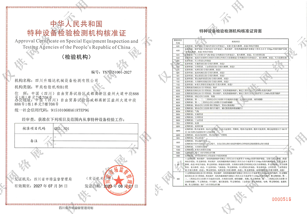 Copyright ? 2021 All Rights Reserved. 四川升瑞達機械設備檢測有限公司 聯(lián)系地址:成都市高新區(qū)益州大道888號智地哥譚1棟7樓705-708號 備案號: