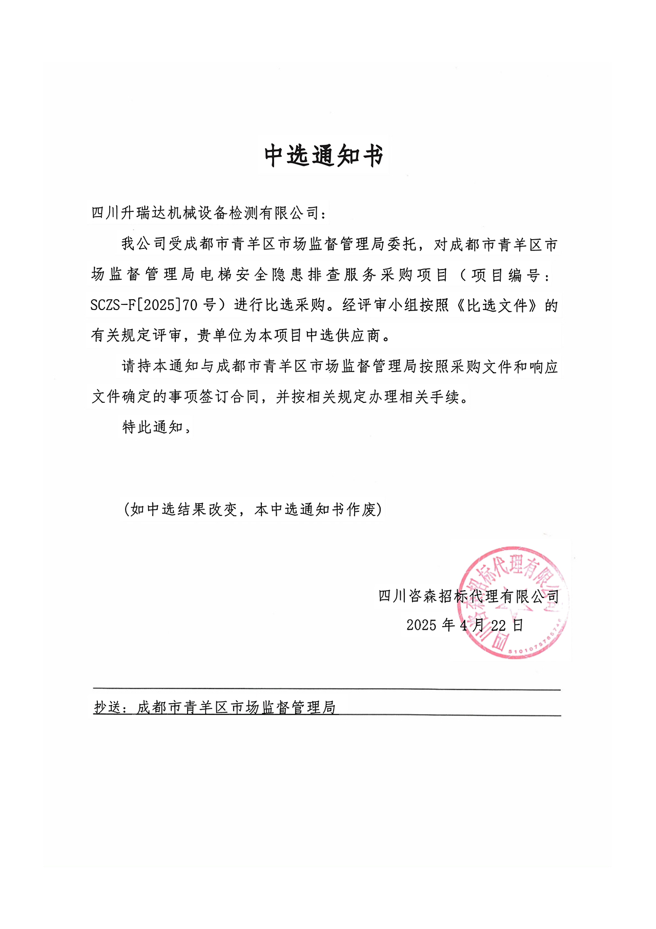 近日,四川升瑞達機械設備檢測有限公司在青羊區電梯安全隱患排查服務項目的激烈競標中脫穎而出,成功斬獲中標資格。這一成果不僅是對公司專業實力的有力佐證,更為其在電梯檢測領域的深度拓展注入強大動能。